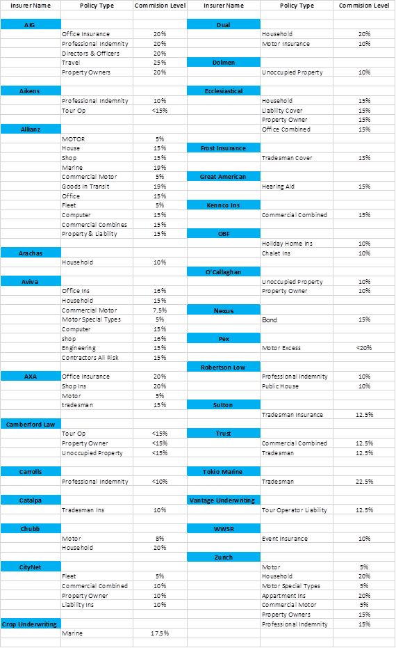 - Commercial (all other classes of business): up to 30% of the premium, midterm adjustments/cancellation up to 15% of the premium.